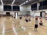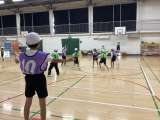 体育館でポートボールのゲームを行なっている3年生。お互いに元気な挨拶をした後、ゲ...