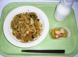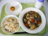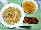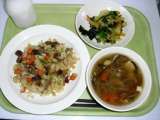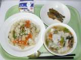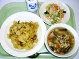 22日(金)の給食では、角切りの焼き豚がたっぷり入った中華風のおこわがとても好評...