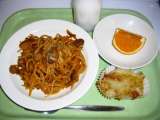 左の写真は4月18日(月)「スパゲッティーナポリタン、ポテトのコーンチーズ焼き、...