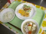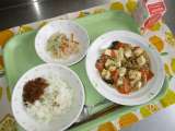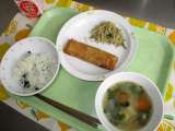 わかめごはん 春巻き もやしときゅうりのごま風味 豆腐とにらのスープ 牛乳 ...