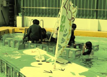 いかだも旗も衣装もできあがり、今日は学校のプールで進水式です! ちゃんと進むかな...