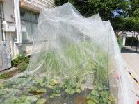 5年生が田植えをした稲が、夏になり本格的に成長してきたので、鳥よけのためにネット...