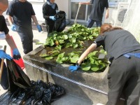 主事さんが、暑い中水田の隣のスイレンがある場所を掃除しています。水中にヘドロがた...