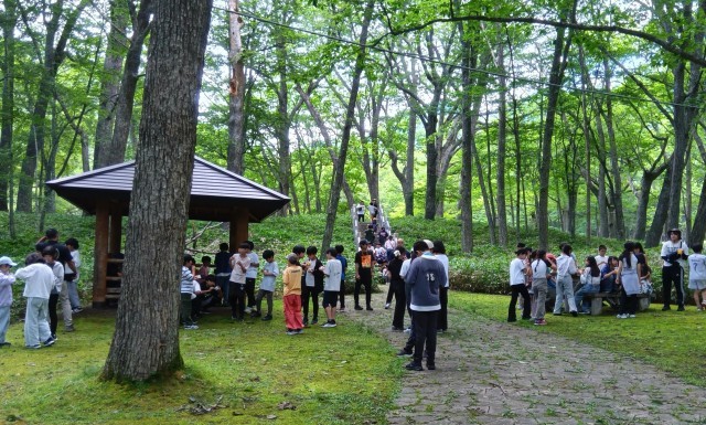 お昼のあとは光徳牧場に移動し、アイスクリームをいただきました。木立の中、楽しく遊びながら味わいました。