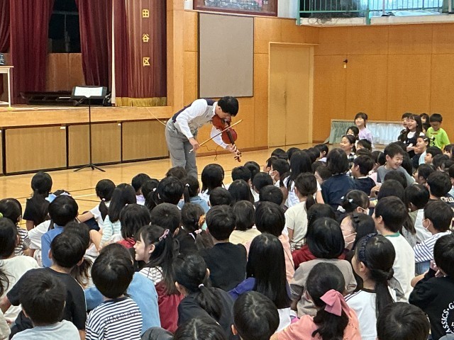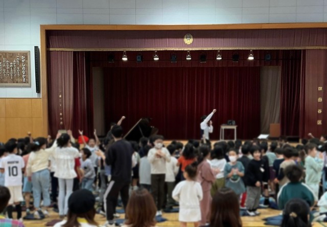 立ってピアノを弾いたり片足でヴァイオリンを弾いたりしながら演奏をしている姿に、子どもたちはとても