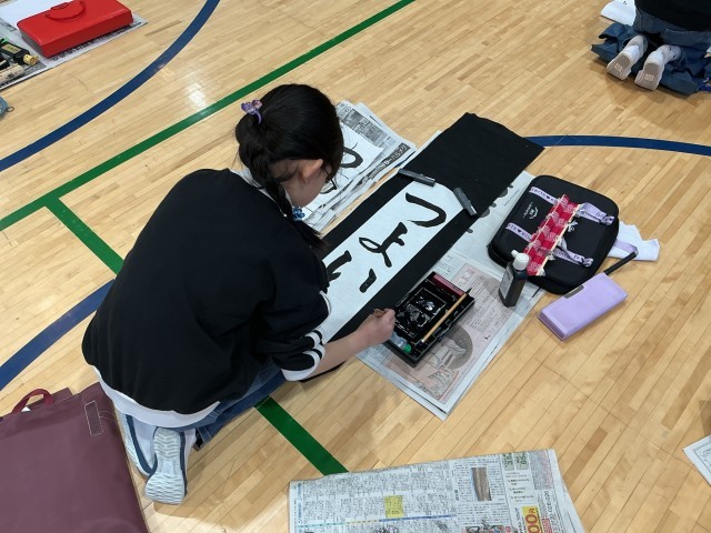 3年生になり、初めての毛筆での書き初め大会を、体育館で行いました。