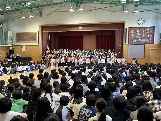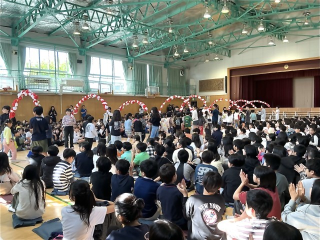 この日に向けて、各学年で「おめでとう」の頭文字を使ったあいうえお作文で、1年生がこれからの学校生活が楽しくなるようなメッセージを考え、練習をしました。 各学年からの、明るく温かいメッセージに迎えられた1年生は、にこにこと嬉しそうでした。