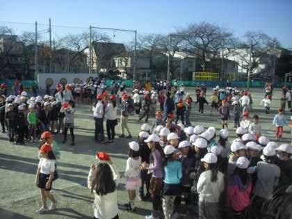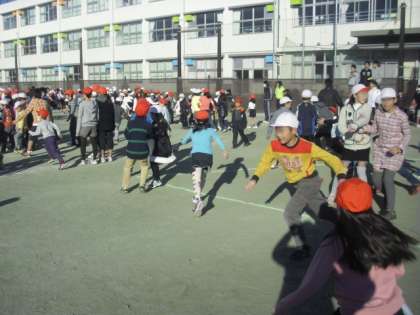 集会委員会のお友達が校庭に15個のスペースをかきました。みんなは、その中に入り、自分のいるスペースから他のスペースへ、鬼に捕まらずに移動することができるかどうか、というゲームです。