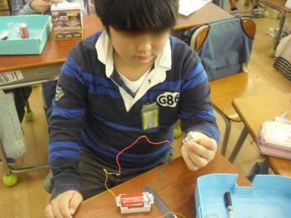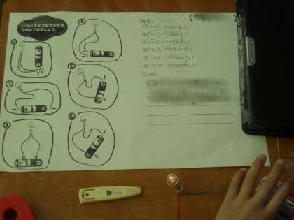 そして、回路に他の物をつないでも、明かりがつくかどうかの実験に移りました。今日は、導線を途中に入れたり、スイッチを入れたりしながら実験していました。