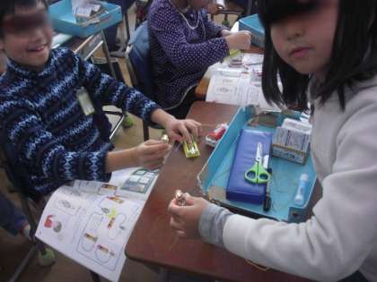 前の時間までに、豆電球に明かりがつくつなぎ方とつかないつなぎ方を学んだ子どもたちは、実験セットに入っている電池ボックスを組み立てました。