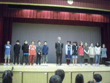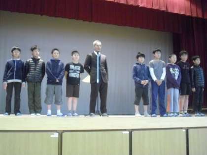 全校朝会では、がんばった子どもたちの紹介をしました。
