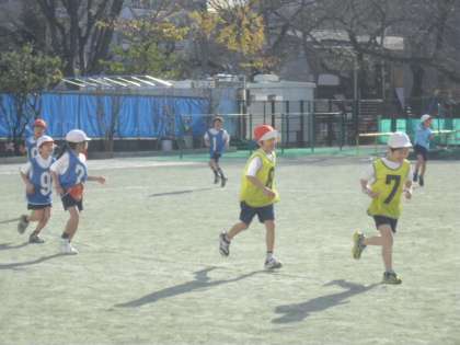 2時間目の2年生の体育です。学習の始まりはランニングで体を温めるとともに持久力を養います。グループで安定したペースで走ることは結構難しいですが、子どもたちは一生懸命に取り組みます。