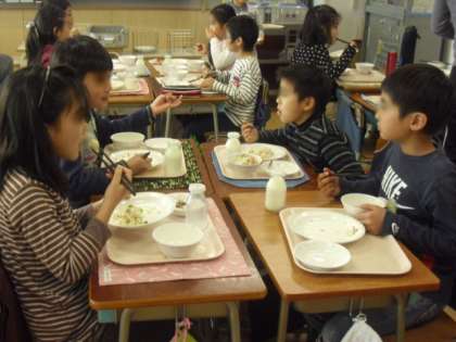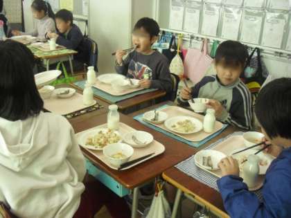 給食を食べながら、笑顔で楽しそうに会話をはずませていました。