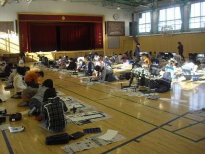1・2校時に約100人の6年生が体育館に集合し、書き初め大会を行いました。