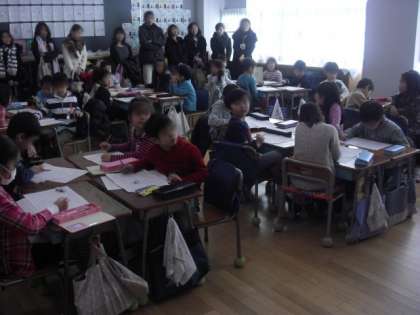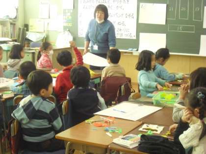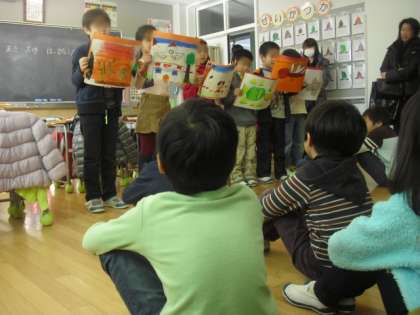 1年3・4組です。日本語「はる なつ あき ふゆ」で、日本の四季から思い浮かぶ言葉を発表したり、自分たちでつくった詩を発表したりしました。3枚目の写真は、1・2年生合同で行う「ひがしのおまつり」の準備です。2月に三島幼稚園のお友達を招待します。