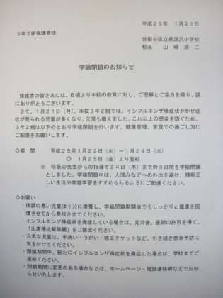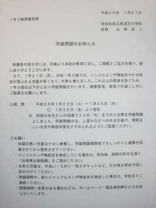 1年3組・3年2組は、インフルエンザ様症状やかぜ症状が見られる子どもが多くなりましたので、1月22日(火)〜1月24日(木)を学級閉鎖とします。