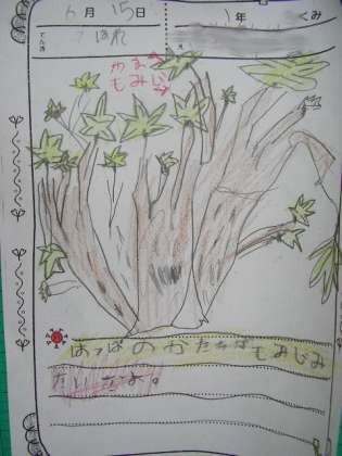 心配されたお天気も今日は、大丈夫!。生活科の探検バックを持って張り切って出発しました。園芸高校までは1年生の足で歩いて25分です。入り口の大きないちょう並木が出迎えてくれました。広い校内を一通り歩いた後、自分のお気に入りの木を探してスケッチしました。「葉っぱがかわいいね」「木の幹がおもしろい!」とそれぞれ気に入った木が見つかり、夢中でスケッチしていました。原っぱでは、かえるやバッタも見つかり、大喜びでした。秋にまた見学に行く予定です。自分のお気に入りの木がどんなふうに変わったか楽しみです。
