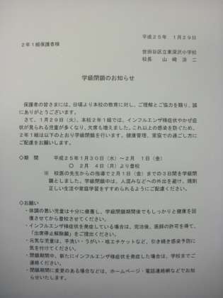 2年1組は、インフルエンザ様症状やかぜ症状が見られる子どもが多くなりましたので、1月30日(水)〜2月1日(金)を学級閉鎖とします。