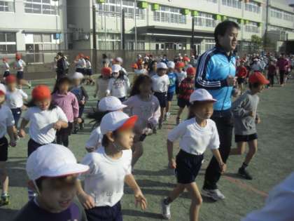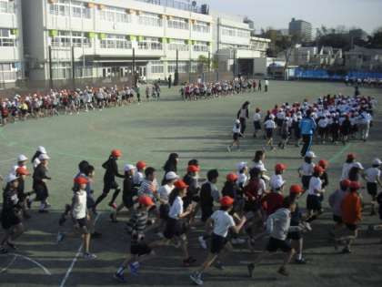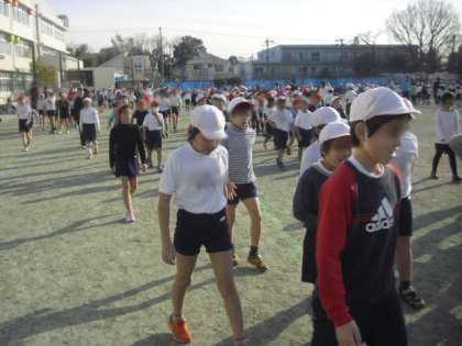 まず、学年によって違うスタート場所に移動しました。そして、マラソンです。最初から最後まで同じペースで走ることが目標の一つです。最後にクールダウンとしてコースを1周歩きました。クールダウンも欠かせません。