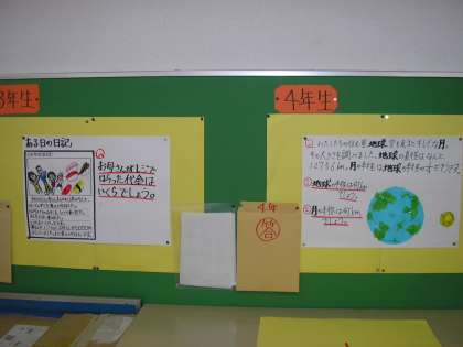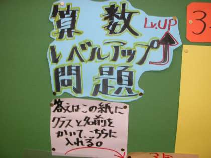 3年生以上の算数は、少人数学習です。算数の教室では、子どもたちが挑戦する問題を用意してくれています。この教室(算数少人数)の担当は、鍛田先生です。鍛田先生は、この3月に大学を卒業した先生1年生。毎日子どもたちがどうしたら算数を好きになってくれるか考え、工夫しています。学校に来たときに、プレハブ校舎の算数教室ものぞいてください。掲示物は、日々進化しています。そうじは、3年2組の担当です。鍛田先生と一緒に算数の教室を毎日きれいにしています。ありがとう。