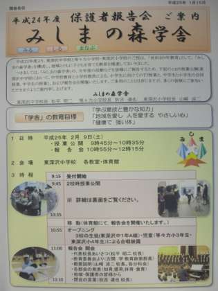 明日の9時45分から12時15分まで、東深沢中学校を会場として、平成24年度みしまの森学舎保護者報告会を開きます。受け付け開始は9時15分です。
