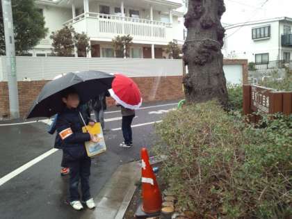 小雪の舞う中、5年生は総合的な学習の時間「地域安全マップ」作成のためのフィールドワークに出かけました。