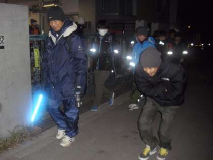 23:25 恒例のおやじの会主催、6年生追い出しイベント「ナイトウォーク」が出発しました。羽田での日の出を目指し、片道16.1km、往復32.2kmを歩きます。今年は6年生が9名参加しています。その他に3名の下級生も参加しています。