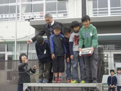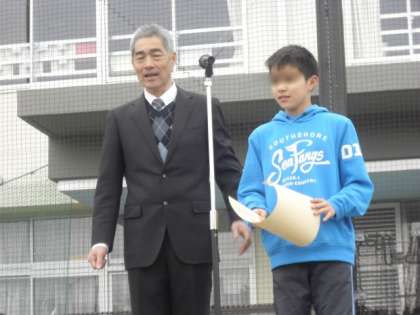 1つ目の表彰は、2月17日(日)に行われた「第13回 自転車の安全な乗り方大会」において準優勝した東深沢ジャガーズの代表のお友達です。3月から4月にかけては、小学生の交通事故が増える時期です。お友達と自転車に乗るときには、お手本を示してほしいと思います。