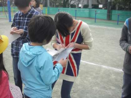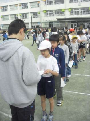 校庭のトラックに並んだ6年生の前に、1〜5年生のお友達が行列を作りました。中には、用紙の枠よりも多くの6年生にサインをしてもらっているお友達もいました。
