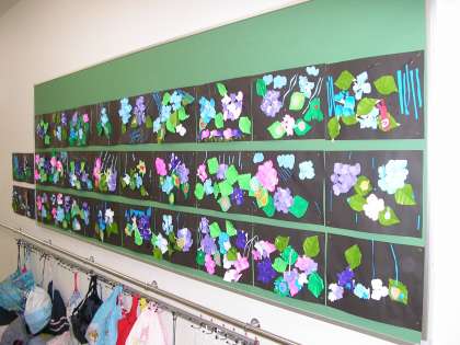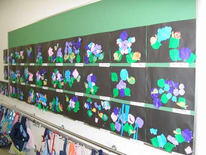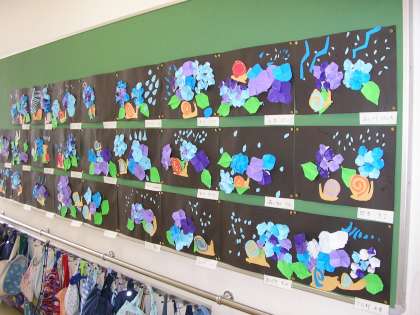 校舎の中に、梅雨の美しい風景を見つけました。2年生の図工の作品です。