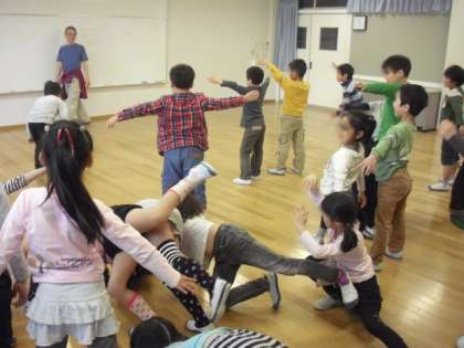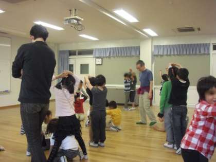 後半は、全身を使って、2人組で「傘」、3人組で「アイスクリーム」、4人組で「いす」を表現しました。活動中は自然と会話が生まれ、「どんないすがいいかな?」「こうすると、もっといいいすになるよ」などと、子どもたち同士で声をかけ合いながら、姿勢や動きを工夫して、いろいろな物を表現することができました。互いに表現したものを見合うと、それぞれグループごとに違う表現の仕方があることに気付き、体で表現する楽しさを知ることができました。