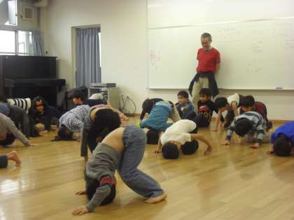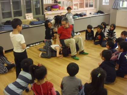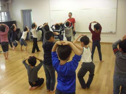 「とくさん」「たばちゃん」のお二人の進行による授業は、はじめは一見楽しく遊んでいるだけのようで、実は後々の「体を使って表現する活動」に結びついていく、素晴らしいものでした。お二人の言葉かけも絶妙で、子ども達もずっと授業に引き込まれ、全身汗だくになって取り組みました。友達同士、相談したり、時には揉めたりしながらも、みんなで協力して体をいっぱいに使って、与えられた課題を表現できました。