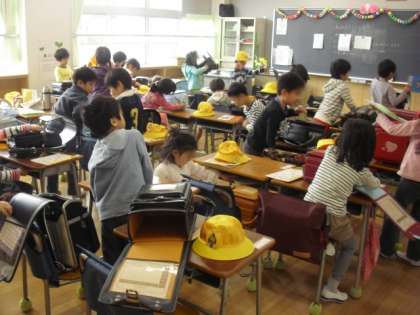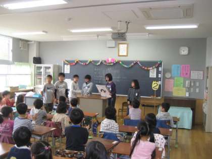 登校すると、教室では6年生が待っていてくれます。1年生は、ランドセルの片づけを手伝ってもらったり、紙芝居を読んでもらったりしています。(6年生の活躍は改めて紹介します)