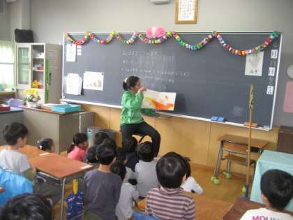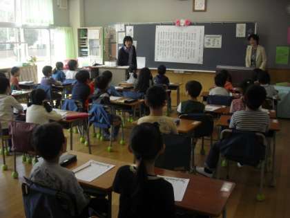名前を書くだけでなく、国語の教科書を読んだり、読み聞かせを楽しんだりもしました。さらに、音楽専科の行方先生と担任の先生と一緒に、ひがしの校歌も練習しました。
