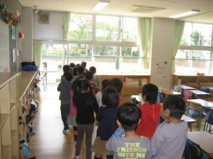 9時45分からは今年度初めての避難訓練でした。1年生は初めてということもあり、校庭の避難場所まで行かずに、教室前の花壇の所で整列です。「おかしも」の約束を守って、押さない、駆けない、しゃべらない、もどらない、がきちんとできていました。