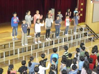 1年生も加わって全学年で手話を交えて歌を歌いました。東深沢小学校が一つにまとまり、明るい歌声が響き渡りました。終わりの言葉を述べる6年生も、堂々と大役をこなすことができました。