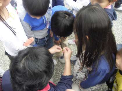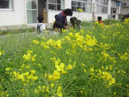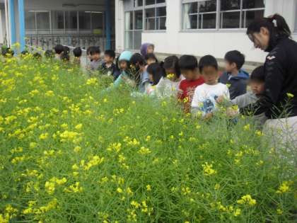 音読を楽しんだ後、外に出ました。今年は、主事さんが種をまいた菜の花が花壇にたくさん咲いています。種の様子も観察しました。
