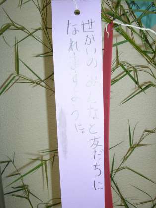 「世かいの みんなと 友だちに なれますように」です。今晩は、天の川が見られそうです。皆さんの願い事はどんなことでしょう。私は、「ひがしの子どもたちが、明るく元気に、大きな事故やケガがなく すごせますように」とお願いします。