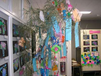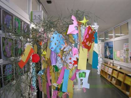 今日は、七夕です。1年生も2年生も教室の前に七夕飾りをしました。一人一人の願いをこめた短冊をささにつけました。