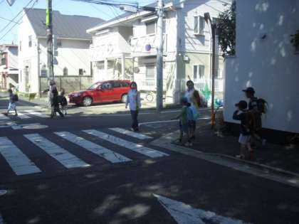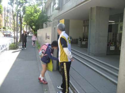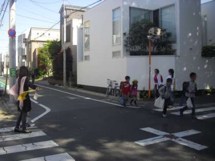 毎月1回行われるあいさつ運動です。保護者の方々や地域の方々が、まちに出て子どもたちに声をかけてくださったり、子どもたちが安全に登校できるように気遣ってくださったりしています。