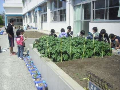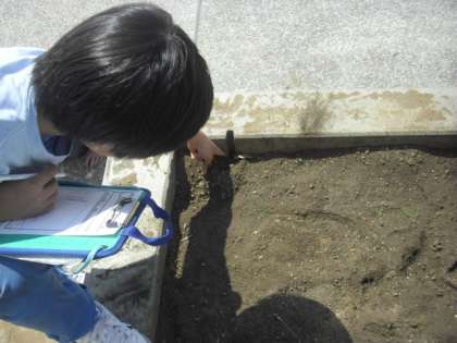 アリの巣を発見し、「ここにアリの巣があります」と知らせているお友達がいました。また、「ジャガイモの花を初めて見ました」と喜んでいるお友達もいました。