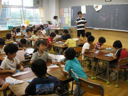 夏休み、子どもたちに日常の学習活動では味わうことのできない体験をさせようとのねらいで夏のワークショップが行われています。先生たちの得意分野を中心にチームを作り、子どもたちの興味関心を高めるような講座を2日間にわたって行います。1年生向けの「紙ひこうきをとばそう」は、百渓先生、川村先生、深川先生、笹木先生です。難しい紙の折り方に時間がかかりましたが、できあがったときは得意そうに飛ばしていました。
