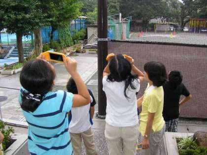 11時15分頃、空に太陽がうっすらと見えました。ワークショップに来ていた子どもたちも遮光板を持って観察です。ちょっとでしたが天体ショーを楽しめました。