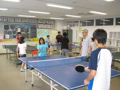 体育館が工事中ですが、教室の机を片付けて卓球台を入れて実施しました。