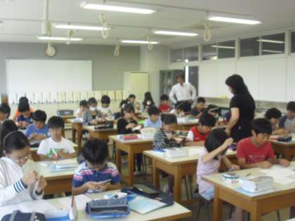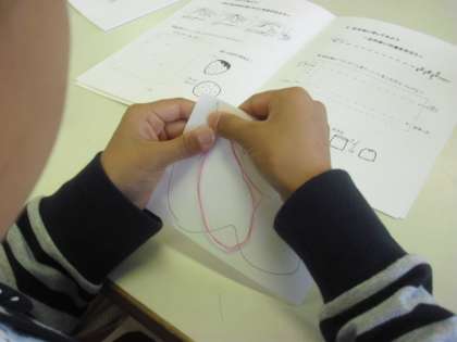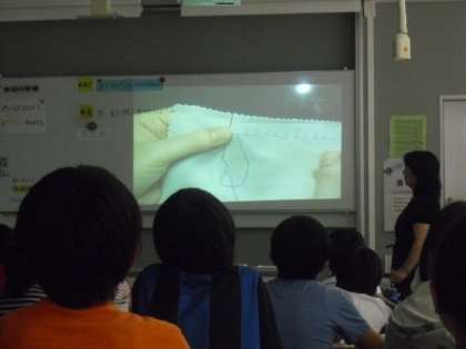 「はじめてみよう ソーイング!」です。今日は「手縫いマスターになろう」というテーマで、「玉止め」の学習です。DVDや絵図でやり方を覚えて、実際に挑戦です。ひとりひとりができるように家庭科の先生も一生懸命です。ぜひご家庭でも練習してみてください。