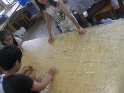 大量のマッチ棒を並べて、いろいろな形を作ったり、協力して大きな形を作ったりしました。