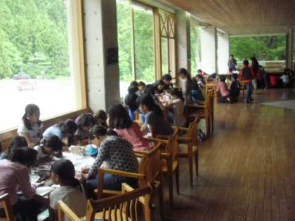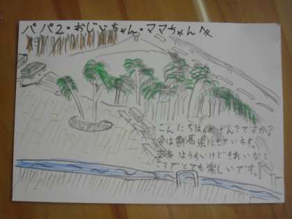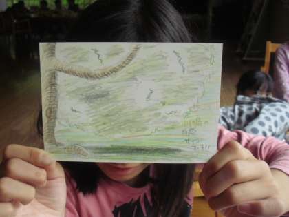 まき割り体験と並行して葉書き書きもすすめました。お家の人へのオリジナル絵ハガキも素敵にできました。