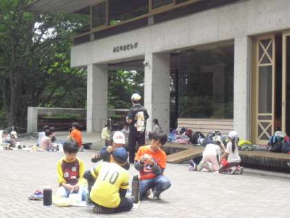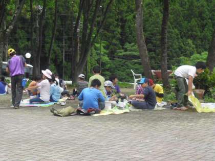 川場最後の昼食です。ビレジのお祭り広場は太陽が顔を出し少し暑くなってきました。木陰にシートを敷いて楽しく食事をしています。
