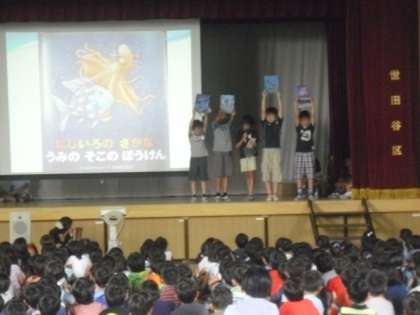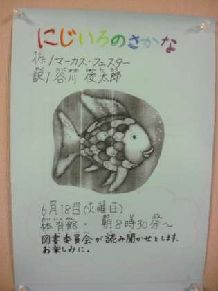 朝の「広場」で図書委員会が、体育館で全校の子どもたちに読み聞かせをしました。題は「にじいろの さかな」