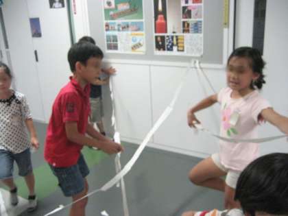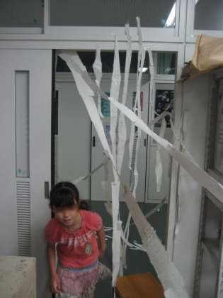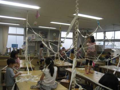 3年生の図工では、細長い紙をたくさん作り、細長い紙の量や感触、空間の特徴を生かして活動する「造形遊び」を行いました。